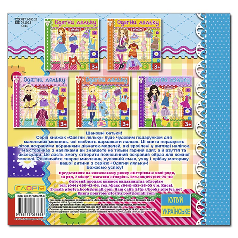 Шановні батьки! Серія книжок «Одягни ляльку» буде чудовим подарунком для маленьких модниць, які люблять наряджати ляльок. Ці книги порадують діток яскравими вбраннями дівчаток-моделей, які зроблені у вигляді наліпок. На сторінках з наліпками ви знайдете не тільки гарний одяг, а й взуття та аксесуари. Це дасть змогу створити повноцінний яскравий образ для кожної моделі. Розвивайте творче мислення, художній смак, уяву і дрібну моторику вашої дитини з серією «Одягни ляльку»! Бажаємо успіху!