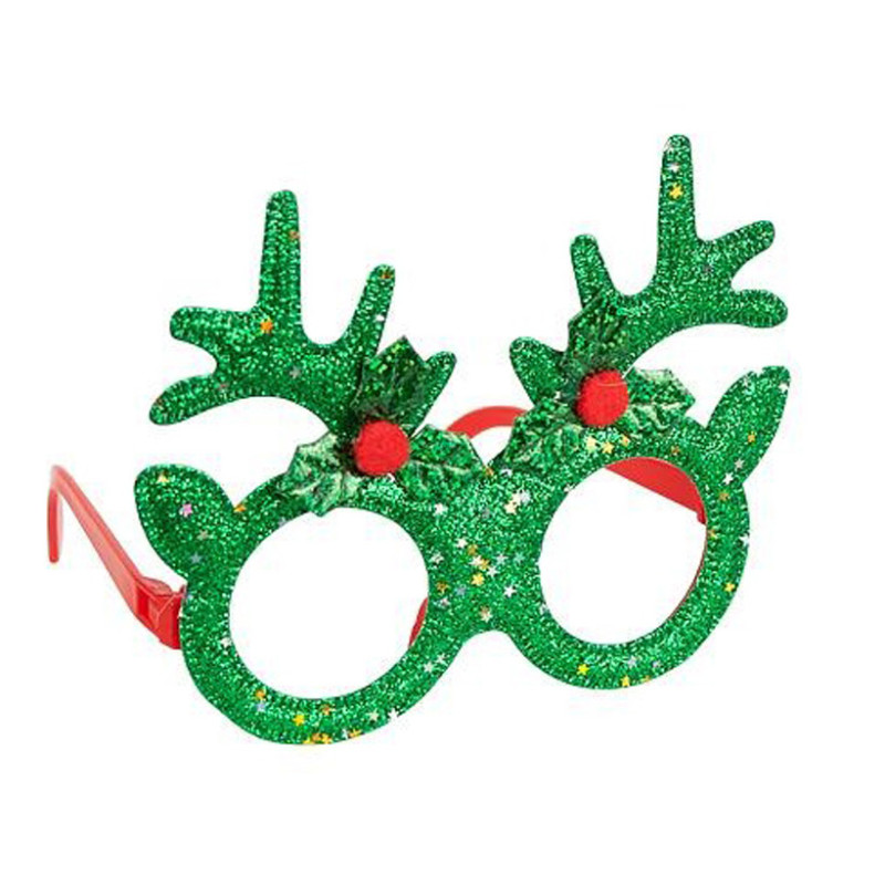 Новорічні окуляри без скелець із декоративними оленячими ріжками та святковим декором. Прикрашені глітером, зеленими листочками й червоними ягідками. Виготовлені з легкого пластику, зручно сидять і добре тримаються. Розмір: ширина 14 см, висота 12 см, діаметр оправи — 6 см. Чудовий аксесуар для карнавалу, фотосесій і святкового настрою.
