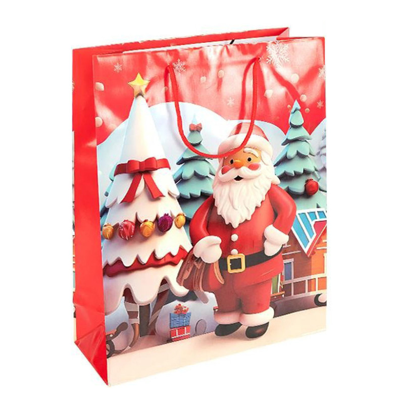 Подарунковий пакет новорічної серії розміром 26×32×10 см — стильне рішення для святкового пакування невеликих подарунків, солодощів і сувенірів. Виготовлений з щільного ламінованого паперу з глянцевим покриттям, стійким до вологи і пошкоджень. Яскравий дизайн із зимовими та новорічними мотивами створює атмосферу затишку та радості. Зручні шнуркові ручки забезпечують комфорт під час перенесення.