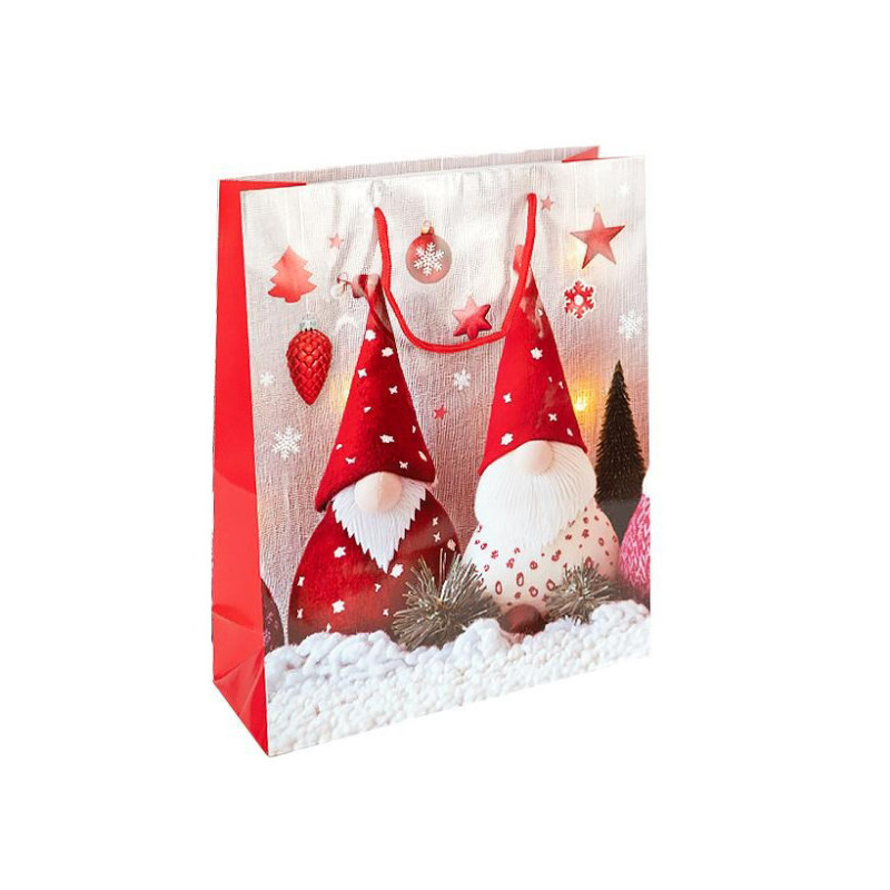 Подарунковий пакет новорічної серії розміром 18х21,5х8 см — стильне рішення для святкового пакування невеликих подарунків, солодощів і сувенірів. Виготовлений із щільного ламінованого паперу з глянцевим покриттям, стійким до вологи та пошкоджень. Яскравий дизайн із зимовими та новорічними мотивами створює атмосферу затишку та радості. Зручні шнуркові ручки забезпечують комфорт під час перенесення.
