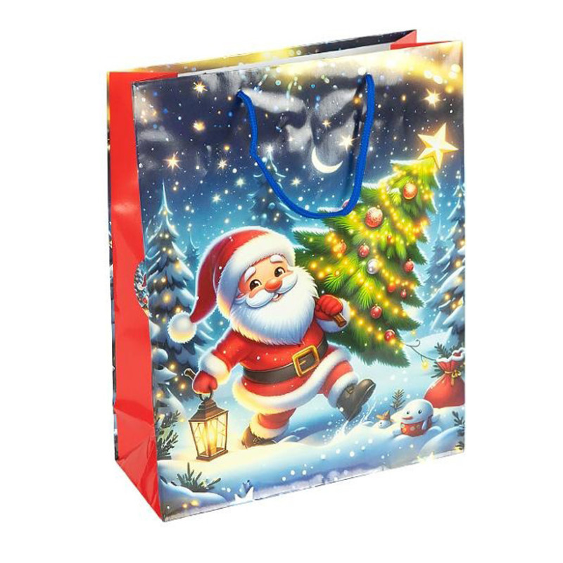 Подарунковий пакет новорічної серії розміром 18×21,5×8 см — стильне рішення для святкового пакування невеликих подарунків, солодощів і сувенірів. Виготовлений з щільного ламінованого паперу з глянцевим покриттям, стійким до вологи і пошкоджень. Яскравий дизайн із зимовими та новорічними мотивами створює атмосферу затишку та радості. Зручні шнуркові ручки забезпечують комфорт під час перенесення.