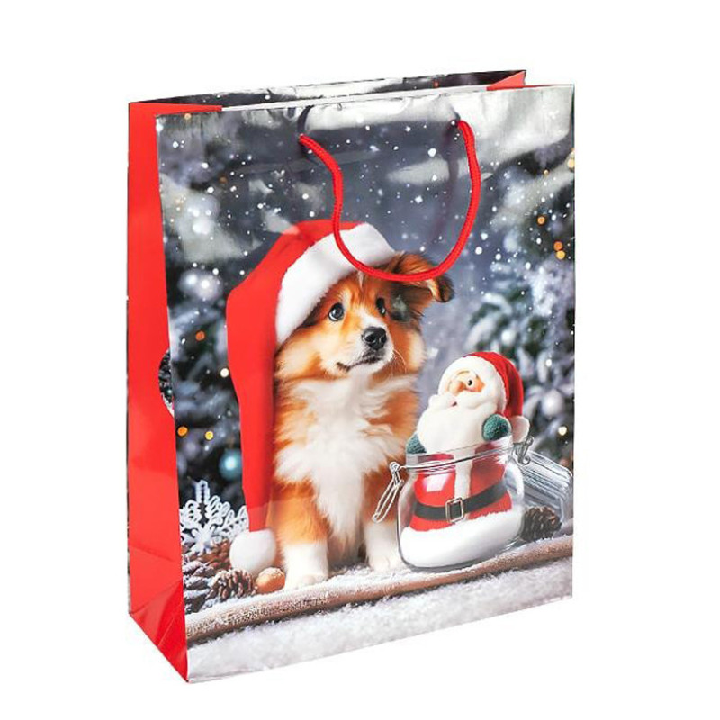 Подарунковий пакет новорічної серії розміром 18×21,5×8 см — стильне рішення для святкового пакування невеликих подарунків, солодощів і сувенірів. Виготовлений з щільного ламінованого паперу з глянцевим покриттям, стійким до вологи і пошкоджень. Яскравий дизайн із зимовими та новорічними мотивами створює атмосферу затишку та радості. Зручні шнуркові ручки забезпечують комфорт під час перенесення.