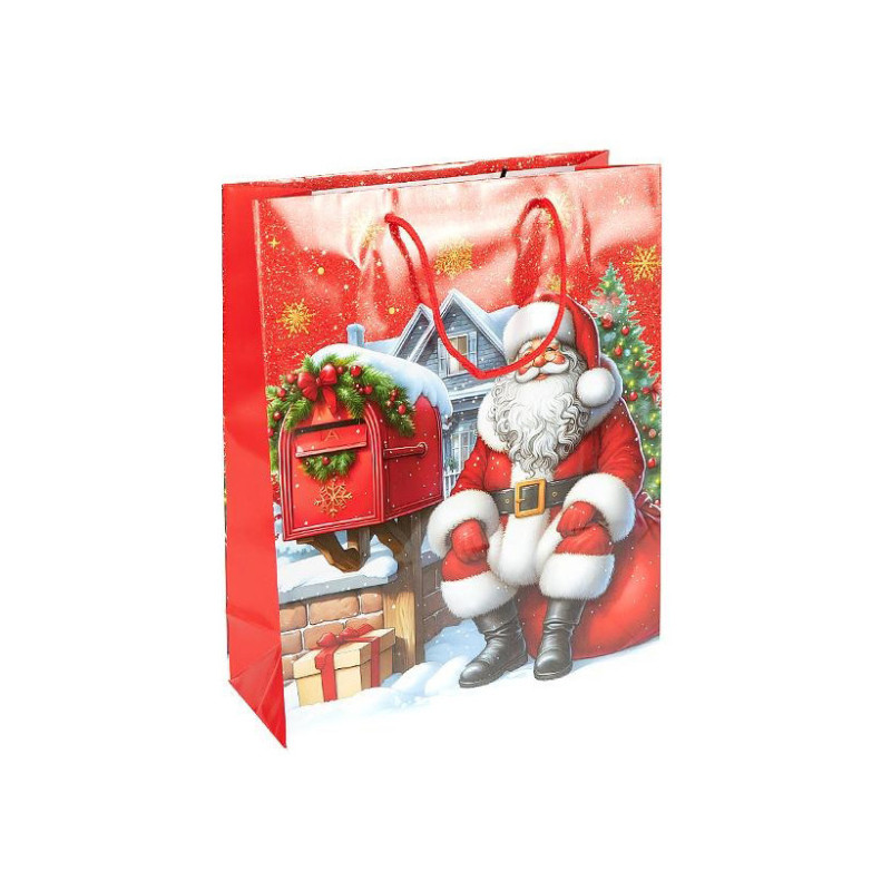 Подарунковий пакет новорічної серії розміром 18×21,5×8 см — стильне рішення для святкового пакування невеликих подарунків, солодощів і сувенірів. Виготовлений із щільного ламінованого паперу з глянцевим покриттям, стійким до вологи та пошкоджень. Яскравий дизайн із зимовими та новорічними мотивами створює атмосферу затишку та радості. Зручні шнуркові ручки забезпечують комфорт під час перенесення.