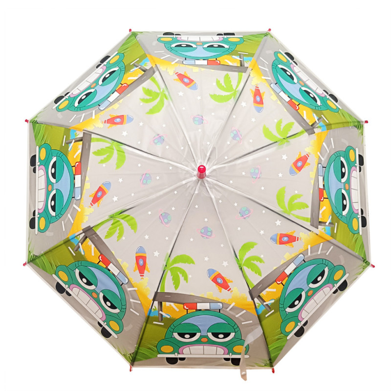 Парасолька – тростина, довжина рукояті 60 см. Кількість спиць 8 шт, довжина однієї спиці 45 см. Діаметр у розкритому вигляді 83 см. Ручка пластикова, гачок. Тонкий, прозорий полімерний матеріал. У комплекті свисток