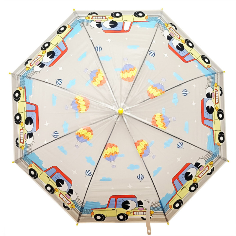 Парасолька – тростина, довжина рукояті 60 см. Кількість спиць 8 шт, довжина однієї спиці 45 см. Діаметр у розкритому вигляді 83 см. Ручка пластикова, гачок. Тонкий, прозорий полімерний матеріал. У комплекті свисток