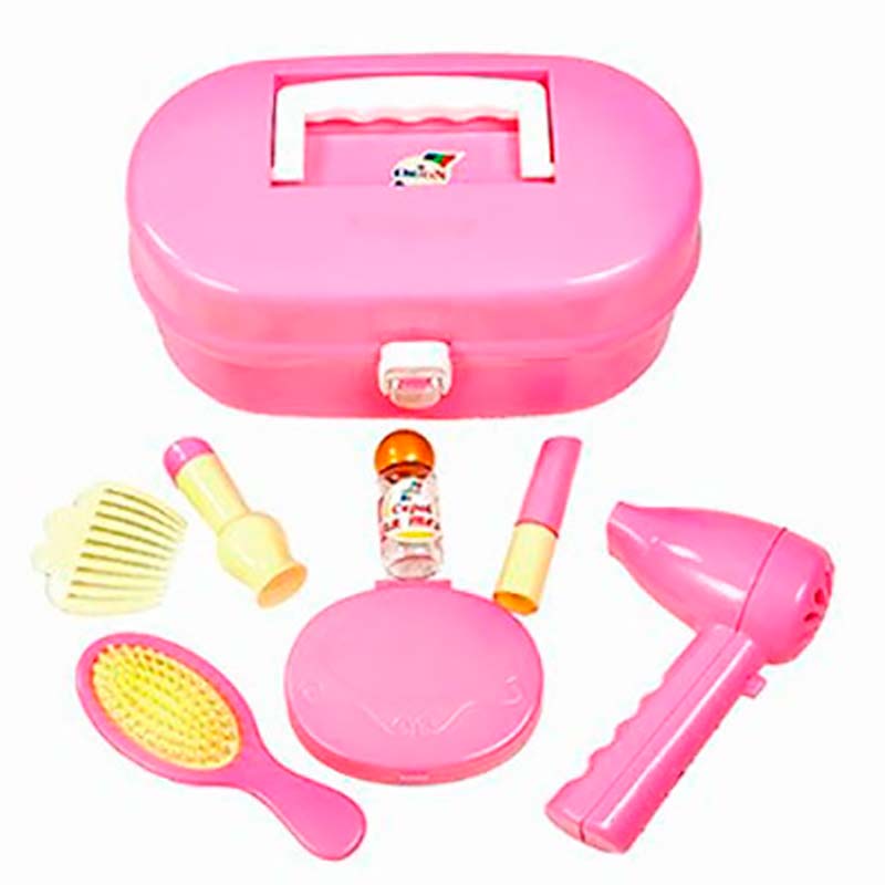 Шкатулочка, в якій поставляються іграшки, має надійний замок, що замикається, і зручну ручку, за яку можна переносити її з місця на місце. З таким комплектом гра в перукарню, б'юті салон або конкурс краси буде ще цікавішою!