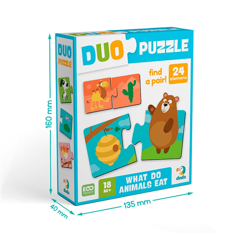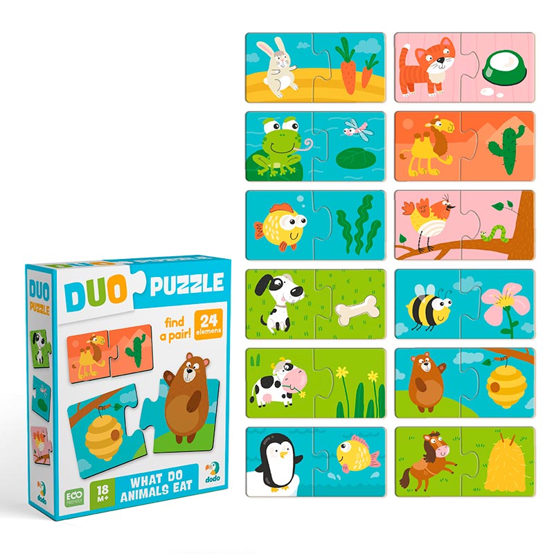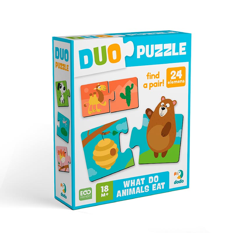 Пазл Dodo DUO “Хто що їсть?” — це ідеальний перший пазл для малюків: корисний, яскравий і продуманий до дрібниць. Він стане чудовим подарунком для дітей від 1,5 років і допоможе перетворити навчання на цікаву гру щодня
