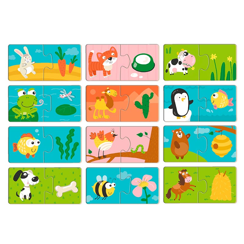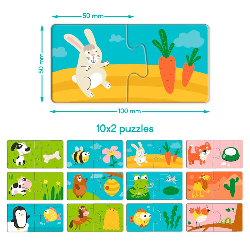 Комплект містить 24 елементи (12 пар), які легко поєднуються між собою, тому малюк швидко відчуває успіх і зацікавлюється процесом складання. Компактний розмір деталей (5 ? 5 см) дозволяє брати пазл у дорогу або на прогулянку, щоб улюблена гра завжди була поруч.