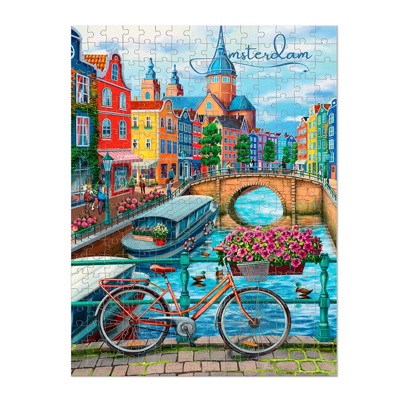 Пориньте в атмосферу одного з найромантичніших міст Європи: вузькі канали, старовинні будинки з кулястими дахами, велосипедні прогулянки під м'яким світлом ліхтарів. Цей пазл — невелика візуальна мандрівка, що відкриває чарівність Амстердама у кольорах і деталях.