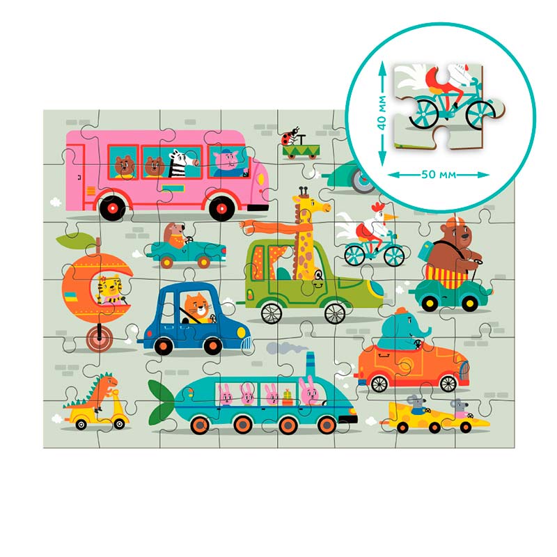 Пазл Dodo "Наздоганяй! На дорозі" складається з 48 елементів і захоплює яскравими ілюстраціями, що перенесуть вашу дитину у світ веселого дорожнього руху. На картинці зображені різноманітні транспортні засоби, якими керують милі тварини: автобус, гоночна машина, велосипед, скутер і навіть одноколісне апельсино-авто.