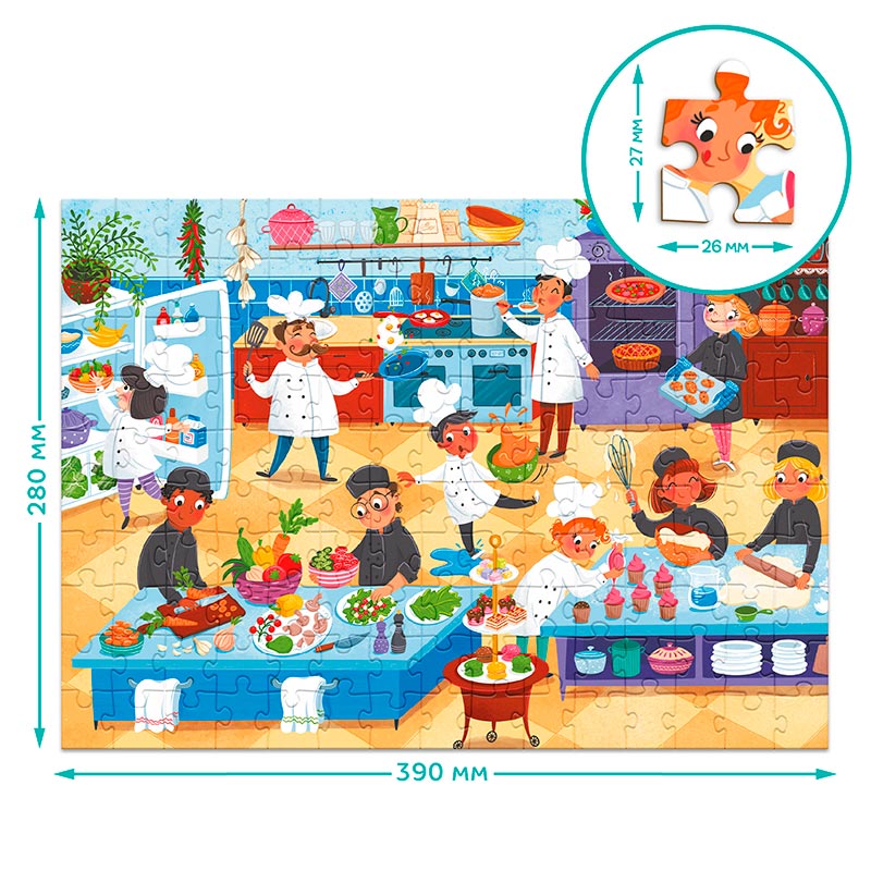 Цей пазл — чудовий спосіб розвинути дрібну моторику, логічне мислення та уважність вашої дитини. В процесі складання пазлу дитина дізнається більше про професію кухаря та побачить, як створюються кулінарні шедеври.