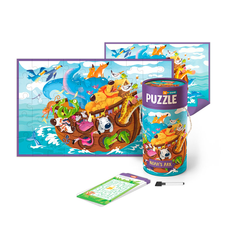 Пазл та гра Ноїв ковчег - чудово підходить для вивчення тварин в ігровій формі. Рекомендовано для дітей від 3 років. Деталі пазла великі, картон щільний, елементи із закругленими кутами для безпеки малюка. Комплектація: двосторонній пазл - 1 шт., двосторонній постер - 1 шт., стираючий маркер - 1 шт., картки із завданнями - 6 шт.
