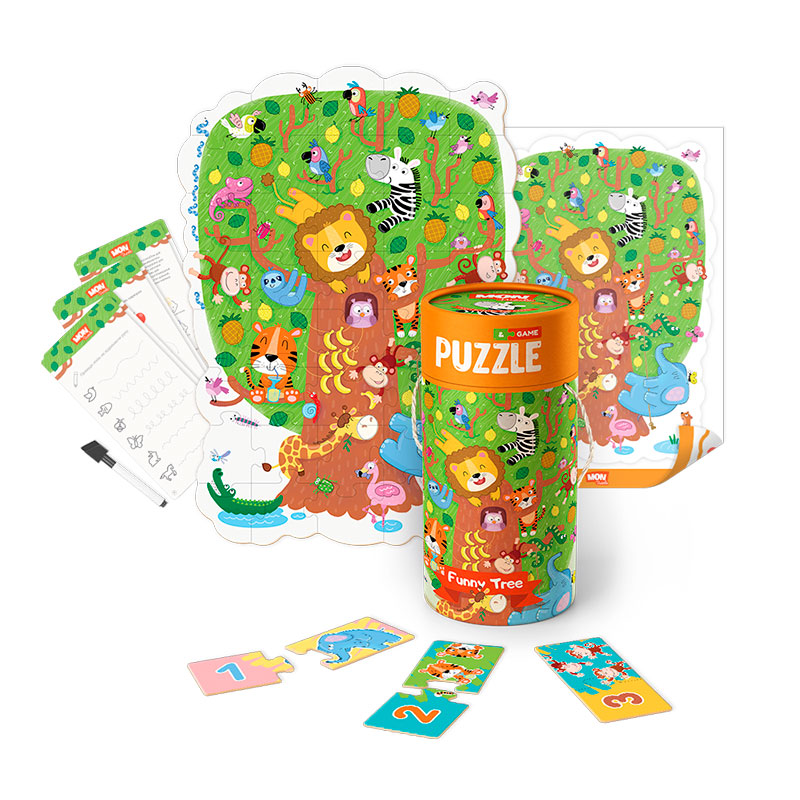 Пазл та гра Чарівне дерево - є ідеальним способом для дітлахів не лише вивчити цифри, а й познайомитися з назвами тварин, фруктів та овочів. Рекомендовано для дітей від 3 років. Деталі пазла великі, картон щільний, елементи із закругленими кутами для безпеки малюка. Комплектація: двосторонній пазл - 1 шт., двосторонній постер - 1 шт., пазли міні - 10 шт., маркер для стирання - 1 шт., картки із завданнями - 6 шт.