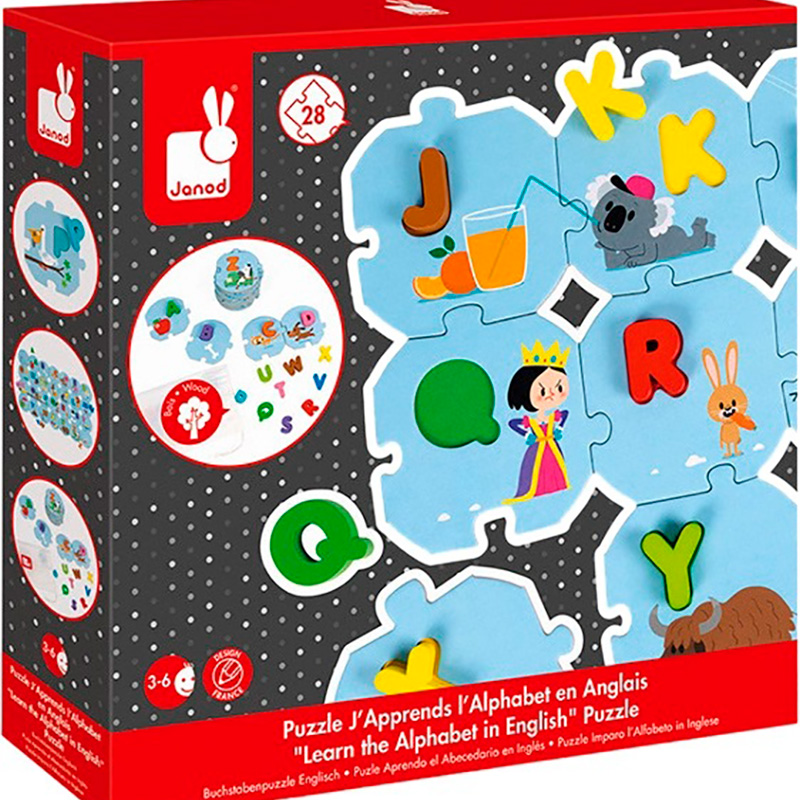 Алфавітний навчальний матеріал: Пазл Janod English Puzzle J02705 складається з 28 великих елементів, кожен з яких представляє одну з літер англійського алфавіту. Ці яскраві та надійні деталі допоможуть дітям запам'ятовувати та впізнавати літери.