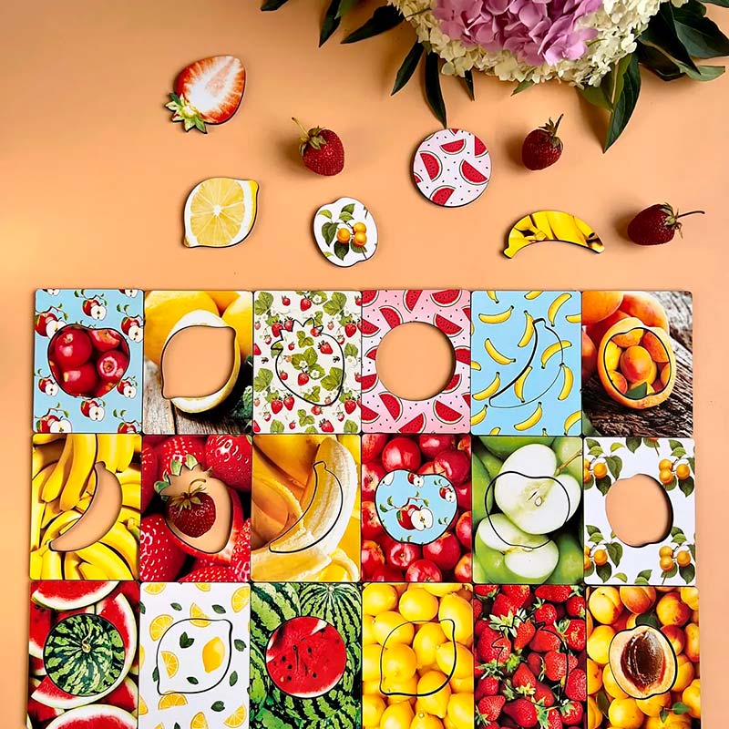 Розмір дощечки: 10 х 7,5 см. У коробочці 18 дощечок з малюнками різних фруктів. Запропонуйте малюкові знайти кожному фрукту свій "будиночок-рамочку". Зверніть увагу дитини на те, що кожен фрукт має співпасти з потрібним "будиночком" не тільки за формою, а й за малюнком. Проговорюйте назви всіх фруктів, таким чином малюк запам'ятає їх легко і швидко. Знайдіть з дитиною однакові вкладиші фруктів (цілих і в розрізі), порахуйте їх. Поговоріть про те, які фрукти на смак: кислі або солодкі.