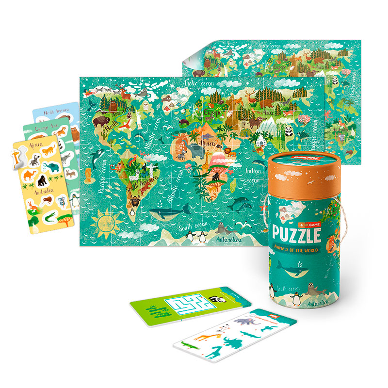 Пазл та гра Тварини світу - це двосторонній пазл-гра. З одного боку пазла зображено мапу світу з континентами та тваринами, що на них мешкають, з іншого - захопливе завдання, виконуючи яке, ми тренуємо дрібну моторику та пам'ять. Комплектація: двосторонній пазл - 1 шт., двосторонній постер - 1 шт., картки з наклейками - 3 шт., картки із завданнями - 6 шт.