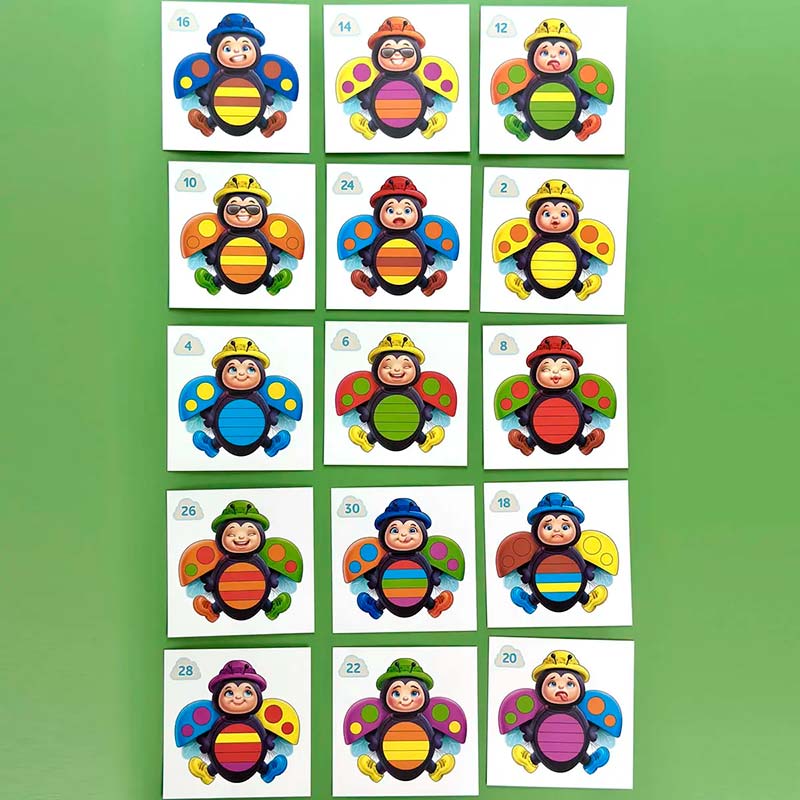 Всі детальки взаємозамінні, збирайте сонечок по картках або ж фантазуйте та створюйте власних різнокольорових жучків.