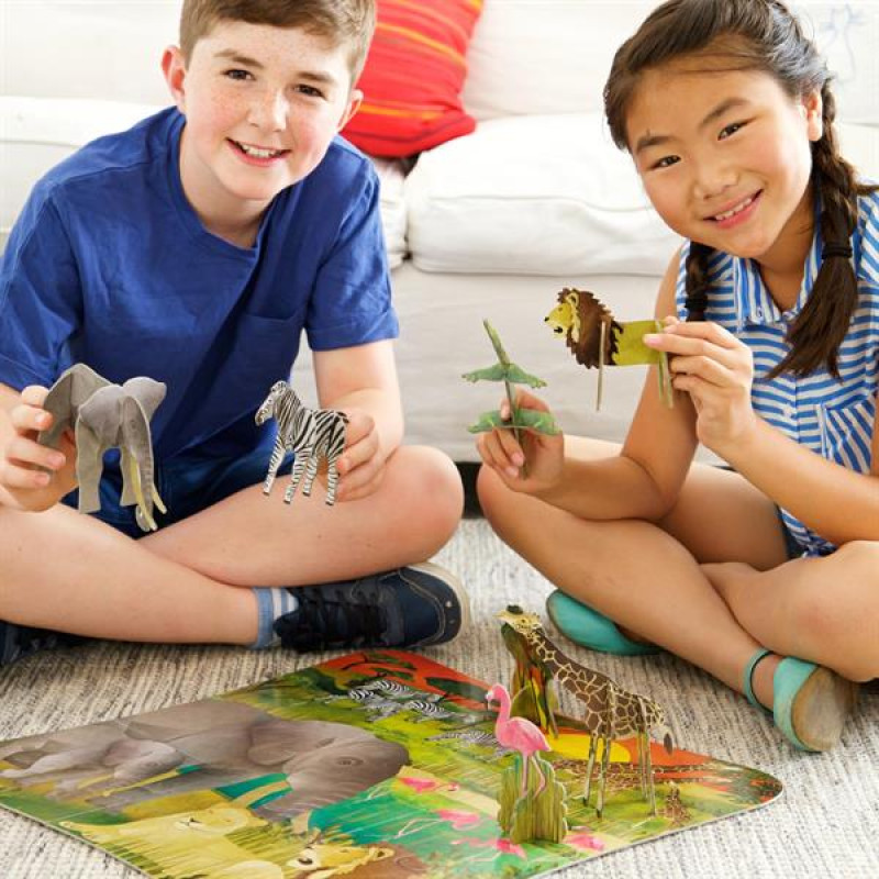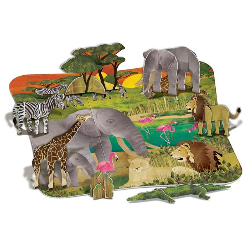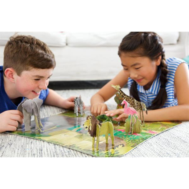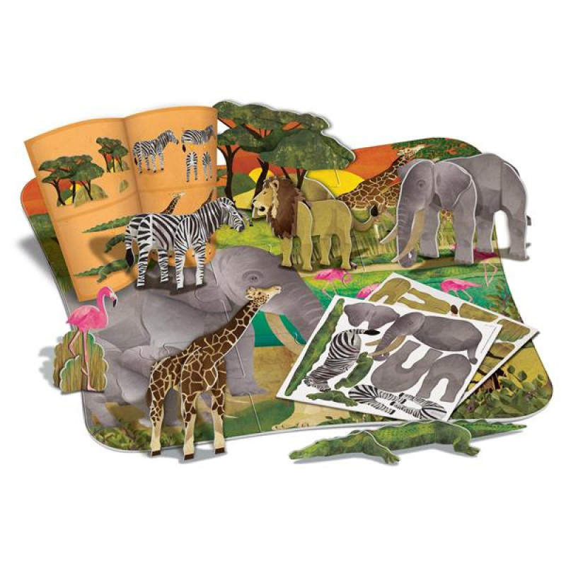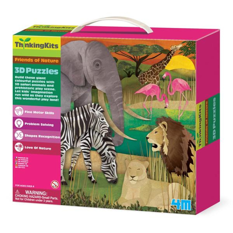 Відправляйтеся в тур по африканській савані з 3D-пазлом від 4М! Ви зберете шість барвистих фігурок диких тварин і квадратне поле для гри розміром 49 см з дев'яти фрагментів. Складати цей тривимірний пазл зручно на підлозі або великому столі. На вас чекають цікаві відкриття! У наборі серії Thinking Kits є кольоровий буклет зі схемами. Ви зберете фігурки жирафи, лева, слона, зебри, фламінго, крокодила. А також складете плоский пазл із зображенням цих тварин у природному середовищі існування. 3D-пазл від 4М зацікавить дітей від 4 років дошкільного віку. Ігри з пазлами сприяють розвитку уяви, мислення, тренують дрібну моторику, довільну увагу, вчать поєднувати кольори і бачити зв'язок між частиною і цілим. Цей пазл у 2016 році отримав нагороду в США 'Вибір батьків'. Підходить для занять у педагогіці Монтессорі.