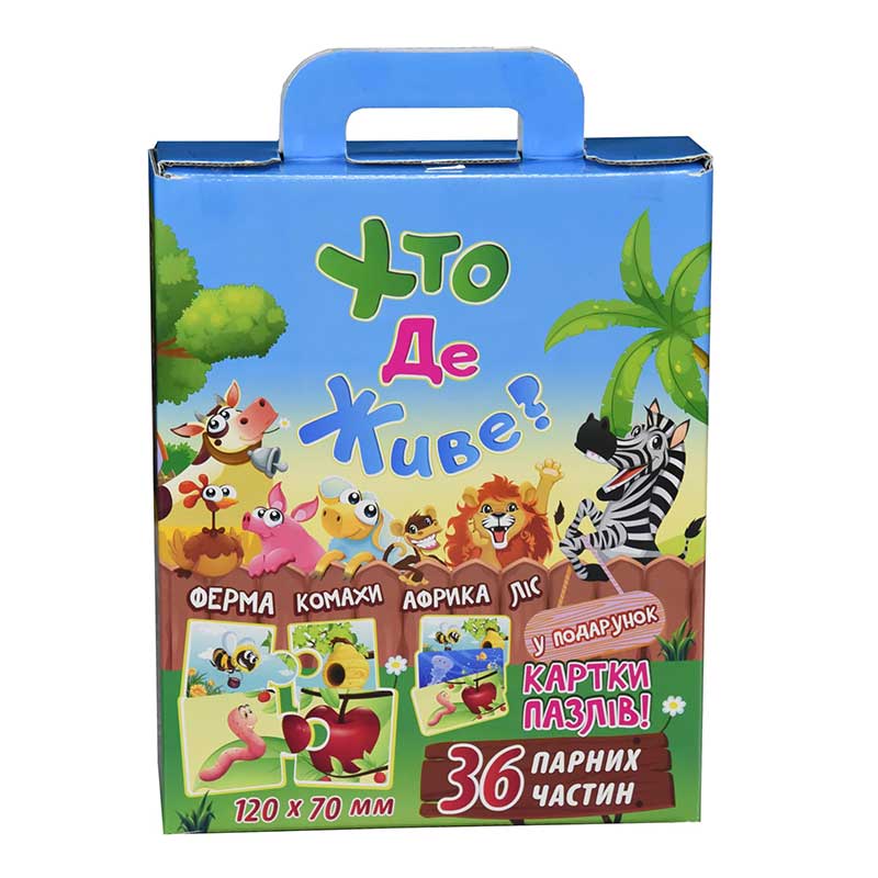 Навчальні пазли «Хто де живе?» познайомлять вашу дитину з мешканцями лісів, домашніми тваринами та комахами. Малюкові необхідно отримати картину з двох частин, підібравши місце проживання кожній тварині. Така гра допомагає розвинути логіку, пам'ять, уява і посидючість. У наборі 36 міні-пазлів, які підходять діткам від 3-х років.