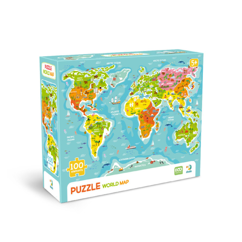 Захопливий та яскравий пазл «World Map» від Dodo — ідеальний подарунок для маленьких дослідників від 5 років! Складаючи карту світу з 100 великих деталей, діти з легкістю запам’ятають розташування материків, океанів, а також дізнаються про визначні об’єкти та тварин, характерних для різних регіонів планети.