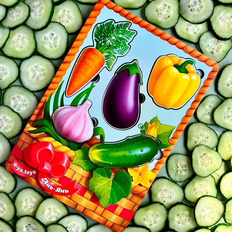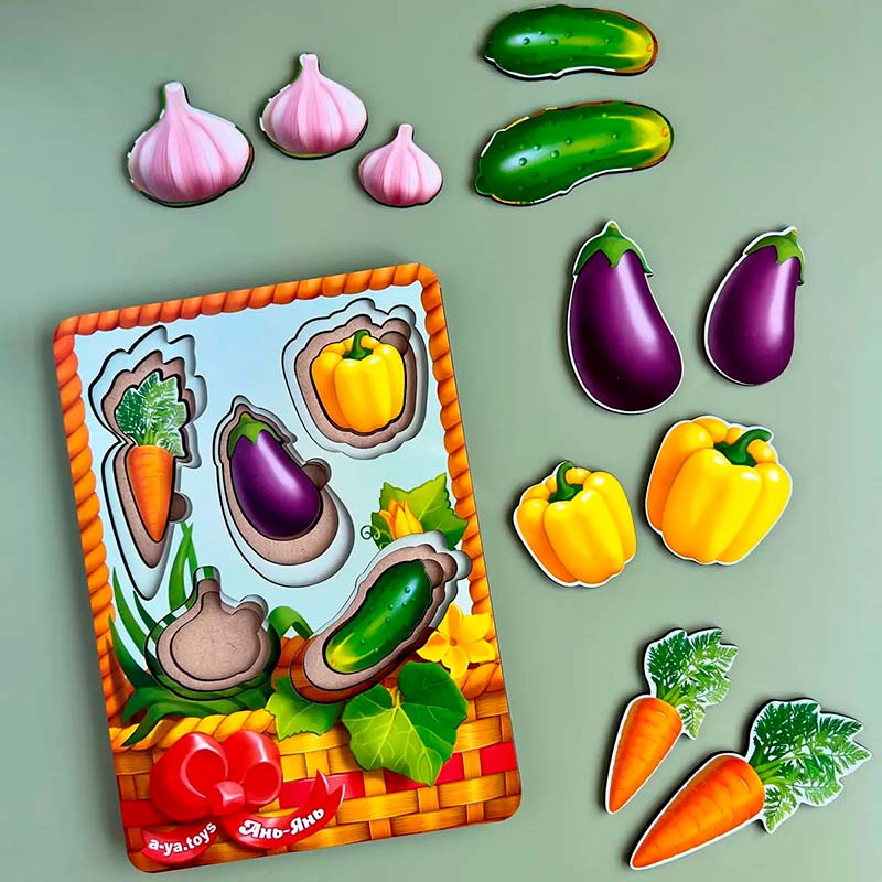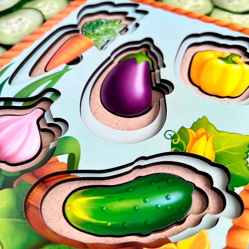 Товщина 1,4 см. У наборі 15 вкладишів 5-ти видів. Для кожного фрукта є 3 вкладиші різного розміру. Маленькі вкладиші ховаються під великими. Для того, щоб їх було зручніше діставати з основи, зроблені спеціальні виїмки. За допомогою такої гри можна познайомити дитину з назвами фруктів. Вивчити поняття "більше-менше". Навчити сортувати предмети за формою і розміром.