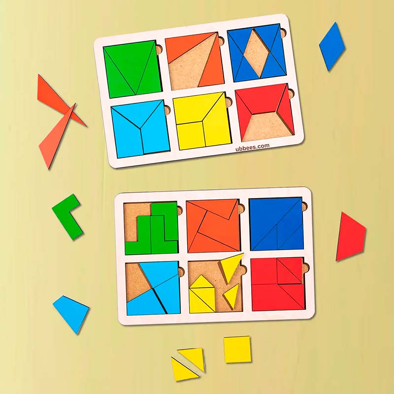 Це не просто пазлик, який треба зібрати, тут треба ще добряче подумати. Ця гра дуже подобається дітям, адже вчить доводити справу до кінця (а це іноді не так легко) та радіти своїм успіхам. Розвиває увагу, терпіння, настирність, посидючість, старанність. А скільки щастя від кожного вдало зібраного квадратика. Всього є 3 такі гри різного рівня складності. 1 рівень - це 2 планшети, на кожному з яких розташовано по 6 квадратів. Квадрати розділені на 1-8 частин різних форм. Розмір 1го квадратика - 6 см. 1 гра - це 2 планшети Починаємо з 1-го рівня і поступово ускладнюємо задачу. З цією грою у дитини розвивається просторове мислення, відчуття кольору та кмітливість. Вона вчиться мислити логічно, вибудовуючи квадрат із фігур різної форми та ступенів складності. У процесі гри дитина знайомиться із сенсорними еталонами форми та кольору, співвідношення цілого та частини.