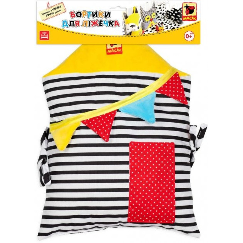 Підвіски-бортики серії «Black & White» TM Macik - незамінний аксесуар в ліжечку вашого малюка. Вони створять затишок і безпеку. Завдяки бортикам ваша дитина огороджена від протягів в кімнаті, а також від ударів об ліжечко. Також варто відзначити, що Борти не дадуть падати іграшкам, а, головне, пляшечці на підлогу. Бортики мають спеціально розроблену кольорову гамму, а контрастні зображення, лінії і фігури сприяють розвитку зіору малюка. Бортики пошиті з натуральних, високоякісних, гіпоалергенних тканин. Кожен бортик надійно кріпиться до ліжечка за допомогою стрічок. Борти прекрасно переносять прання. Бортик «Будиночок» прекрасно прикрасить ліжечко малюка і стане відмінним доповненням до бортикам «подушечки» і «хмаринку»! Розмір: 27х40х7,5 см. Розмір в упаковці: 30х48х10 см.