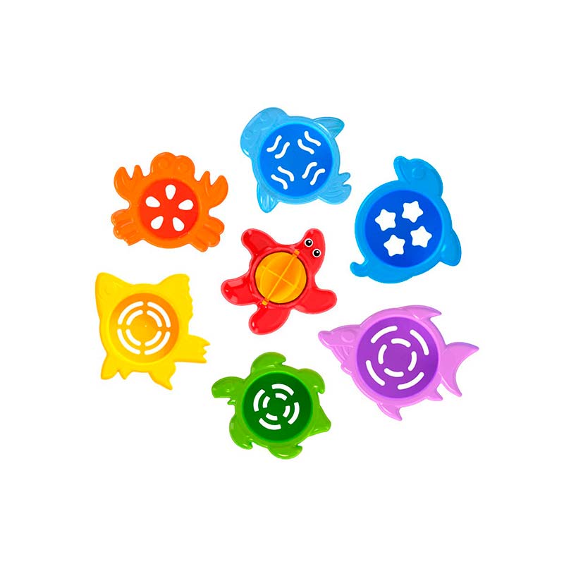 Всі елементи можна зібрати у пірамідку від більшого до меншого, або вкласти один в один. Розміри кожної фігури підібрані пропорційно - найбільша «акула», а найменша «морська зірка». Кольори – як веселка, від червоного до фіолетового.