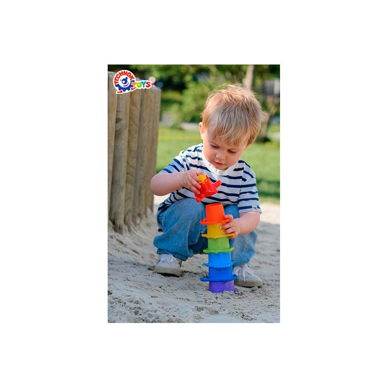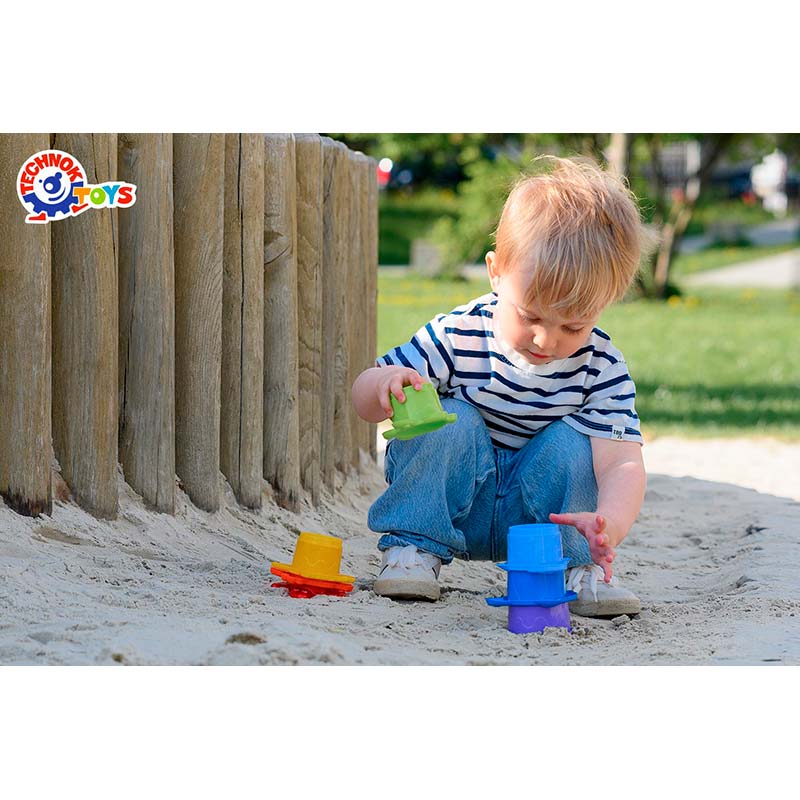 На верхній фігурі «морська зірка» є млинок, що обертається при наливанні водички. Через різні ситечках на дні кожної формочки водичка «втече з пірамідки». І так можна гратися безліч разів. Елементи пірамідки також добре використовувати як пасочки, а ситечко на дні – як штамп на піску.