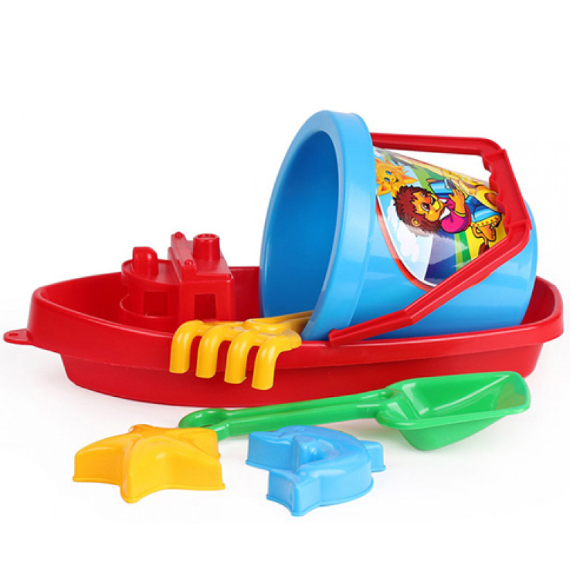 Пластмасовий кораблик із відерцем, лопаткою, грабельками та 2 пасочками.