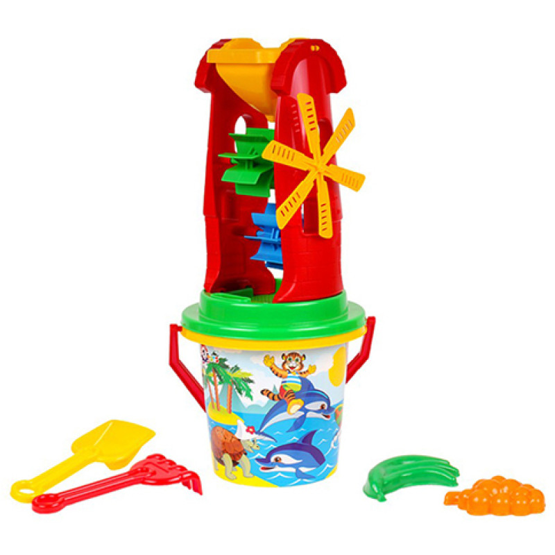 Пісочний набір №6 складається з відерця (12,5 х 16 см), сита, млина, грабельки, лопатки, 2 пасочки