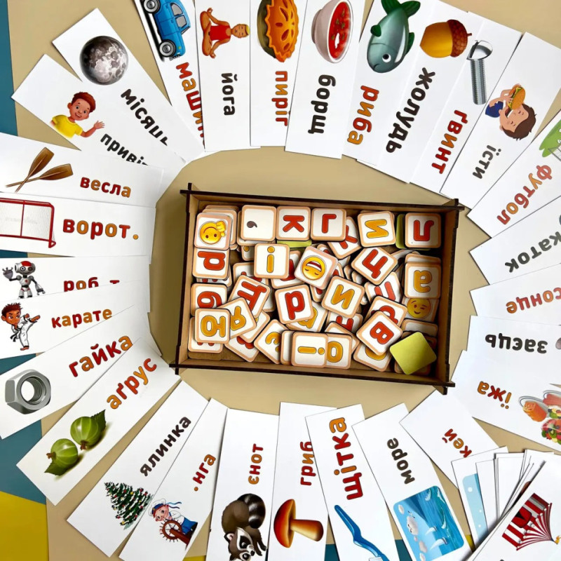 Дитині необхідно вибрати картку та скласти з літер намальоване слово. Збираємо слова, вчимо літери та склади, рахуємо та сортуємо літери.