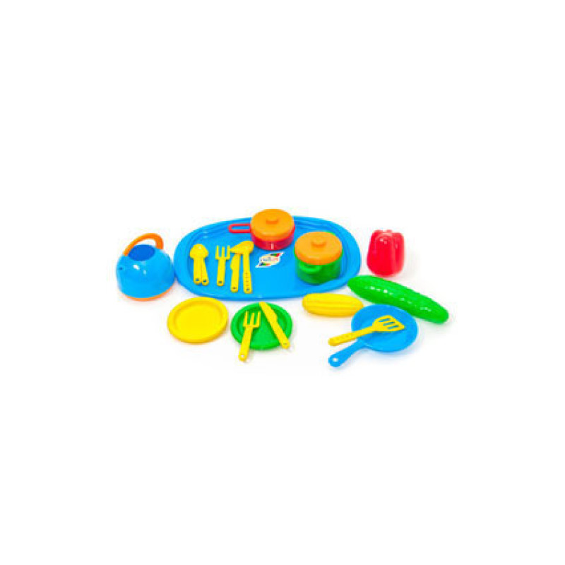 До комплекту входять - таця, каструля з двома ручками з кришкою, каструля з однією ручкою з кришкою, сковорідка без кришки, чайник без кришки, 2 тарілки, 2 ложки, 2 виделки, 2 ножі, соусна ложка, лопатка, а також овочі - кукурудза, огірок, перець.