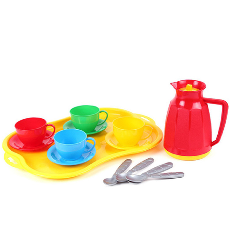 Комплект складається з 4-х чашок, тарілок і ложок, глечика і таці.