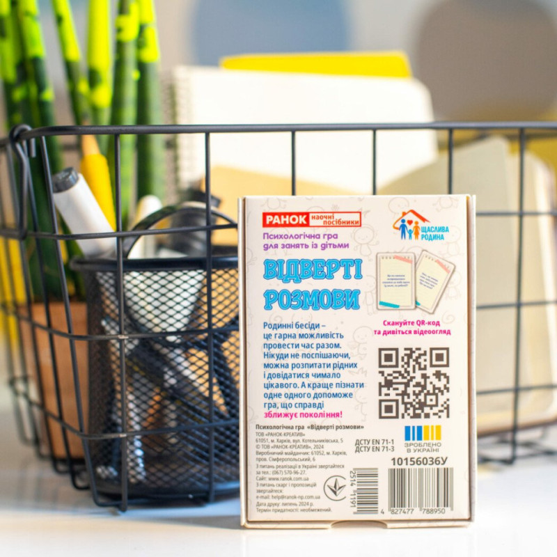 Чи завжди ви щирі одне з одним? Гра підкаже, як зробити ваші сімейні стосунки кращими й теплішими. Зберіться разом за вечерею та насолодіться захоплюючими бесідами, які допоможуть зламати бар’єри і розкрити серця.