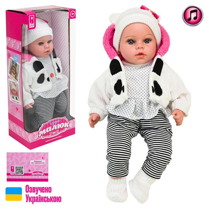 Ніжна та затишна іграшка, створена для обіймів, гри та навчання. Пупс дарує відчуття справжнього піклування: він м'який на дотик, привабливий зовні і має вбудований звуковий модуль з фразами українською мовою.