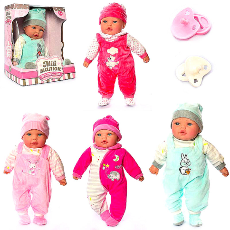 Пупс, м'яконабивний, звук (рос), соска, бат (табл), 4види, в кор-ке (20) M 5423 RU
