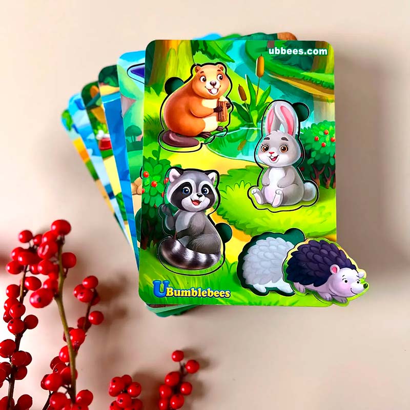 Міні-вкладиші з підказкою-силуетом кожної тварини на дні. Рамки-вкладиші розвивають дрібну моторику пальчиків (яка безпосередньо пов'язана з розвитком мови), координацію рухів, сенсорику, тактильні відчуття, допомагають навчити початковому рахунку (від 1 до 4), вмінню порівнювати розміри (маленький-великий, більше-менше).