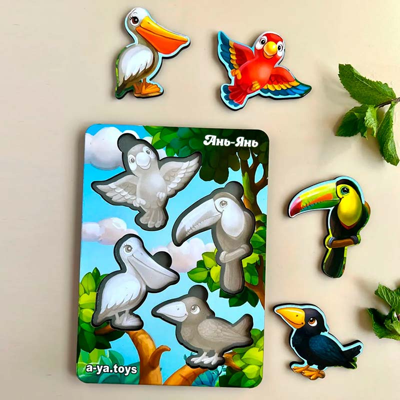 Міні-вкладиші з підказкою-силуетом кожної пташки на дні. Рамки-вкладиші розвивають дрібну моторику пальчиків (яка безпосередньо пов'язана з розвитком мови), координацію рухів, сенсорику, тактильні відчуття, допомагають навчити початковому рахунку (від 1 до 4), вмінню порівнювати розміри (маленький-великий, більше-менше).