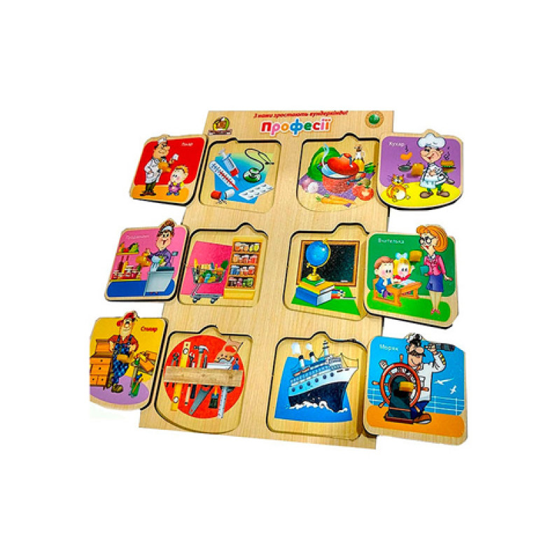Дерев'яна іграшка Рамка-вкладиш Професії - навчить дитину розрізняти розміри, за допомогою цієї іграшки батьки з малюком можуть виконати цілу серію завдань на розвиток дрібної моторики пам'яті та уваги.