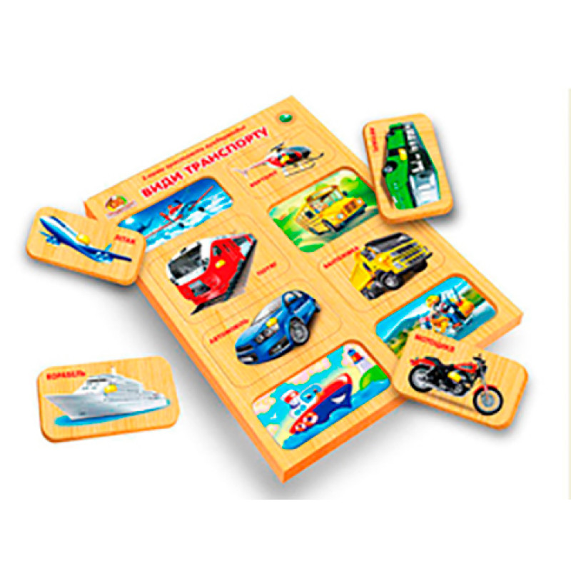 Дерев'яна Рамка-вкладиш Види Транспорту з ручками та підшаровим малюнком - навчить дитину розрізняти розміри, за допомогою цієї іграшки батьки з малюком можуть виконати цілу серію завдань на розвиток дрібної моторики пам'яті та уваги.