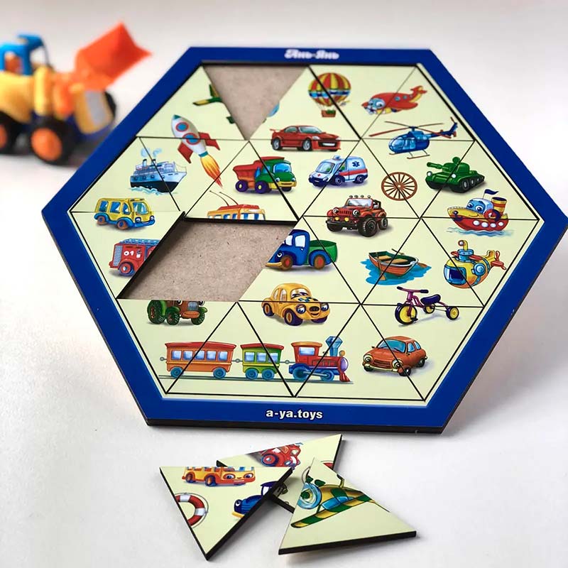 Деталі пазлу у вигляді трикутників, а сама основа - це шестикутник. Потрібно зібрати пазл з усіх трикутників так, щоб отримати картинку з транспортом. Наглядно покажіть дитині, що таке "частина і ціле". Можна порахувати транспорт.