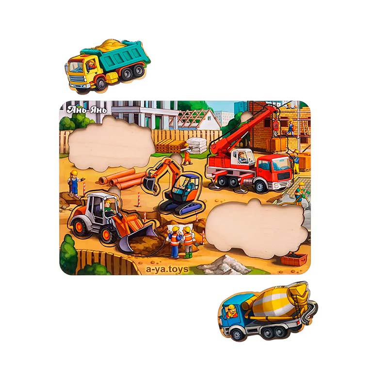 Яскравий тематичний фон цього сортера дітям цікаво буде розглядати та вивчати у деталях, а вкладиші будівельної техніки зручно діставати пальчиками та вкладати на свої місця за формою. Можна також порахувати техніку та поговорити про її функцію в будівництві.
