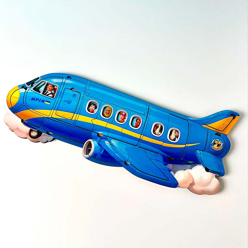 Розмір: 47*18 см 50 деталей Вік: 2,5 р+ З цим пазлом ваша дитина дізнається багато нового 1.Що то за професії пілот та стюардеса? 2. Хто перебуває на борту та хто такі пасажири ? 3.Як це бізнес та економ клас? 4. Що таке ручна кладь та багаж? 5. З чого складається літак, що таке шасі та турбіна? 6. А яка там кабіна у пілота та нащо йому скільки приладів для керування?