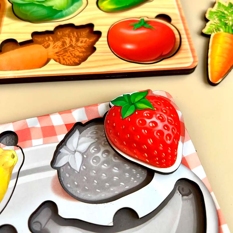 Міні-вкладиші з підказкою-силуетом кожного фрукта на дні. Рамки-вкладиші розвивають дрібну моторику пальчиків (яка безпосередньо пов'язана з розвитком мови), координацію рухів, сенсорику, тактильні відчуття, допомагають навчити початковому рахунку (від 1 до 4), вмінню порівнювати розміри (маленький-великий, більше-менше).