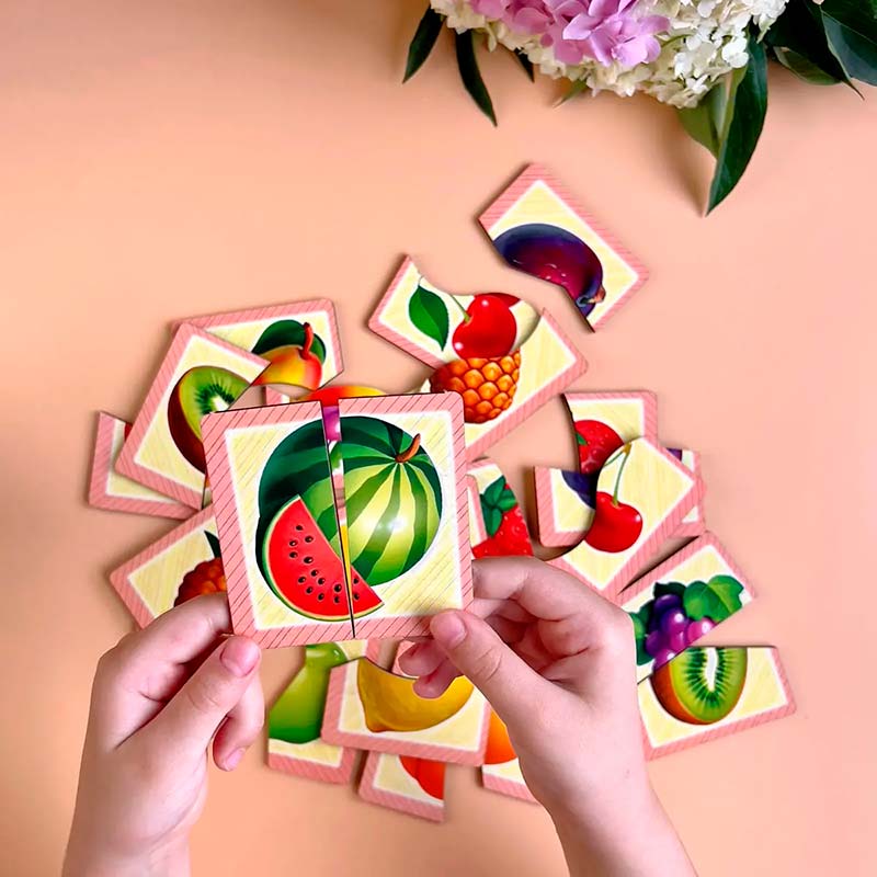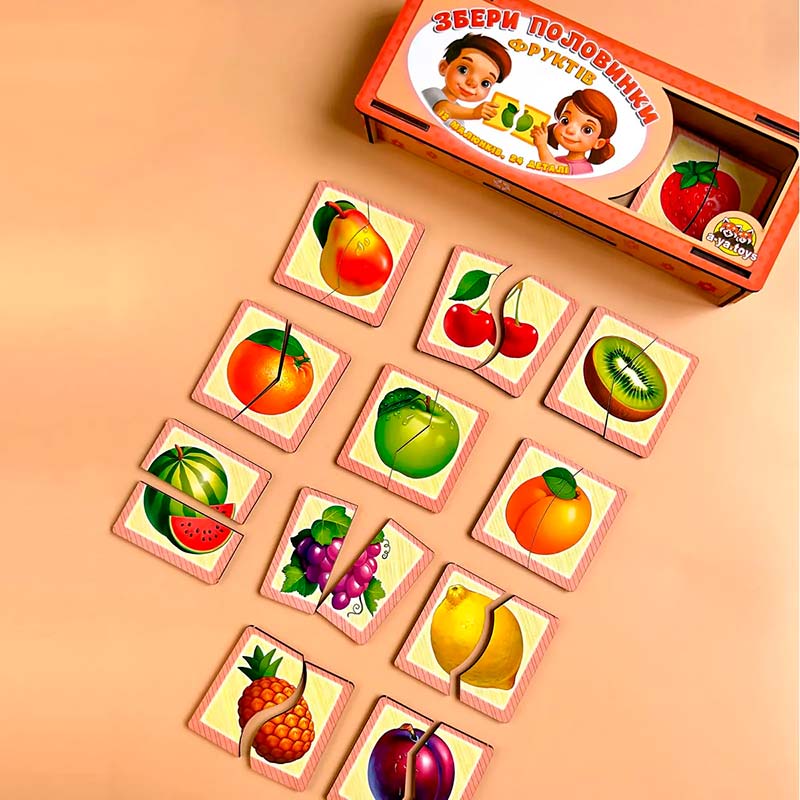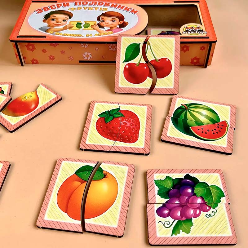 Розміри однієї цілої картинки: 7 х 7 см. У наборі: 12 тематичних картинок-половинок з різним розрізом. Картинки-половинки - це цікава розвиваюча гра, в якій потрібно скласти картинку з двох частин. Гра сприяє розвитку образного і логічного мислення, вчить сприймати зв'язок між частиною і цілим, розвиває дрібну моторику і увагу. Завдання дитини - з'єднати половинки так, щоб отримати цілі картинки.