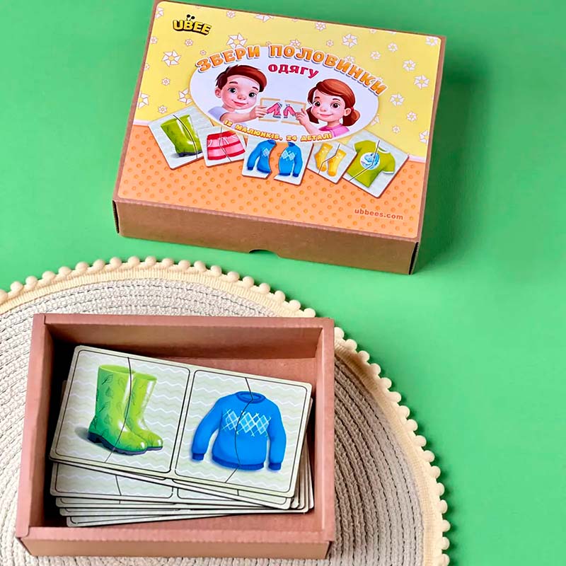 Розміри однієї цілої картинки: 7 х 7 см. У наборі: 12 тематичних картинок-половинок з різним розрізом. Картинки-половинки - це цікава розвиваюча гра, в якій потрібно скласти картинку з двох частин. Гра сприяє розвитку образного і логічного мислення, вчить сприймати зв'язок між частиною і цілим, розвиває дрібну моторику і увагу. Завдання дитини - з'єднати половинки так, щоб отримати цілі картинки.