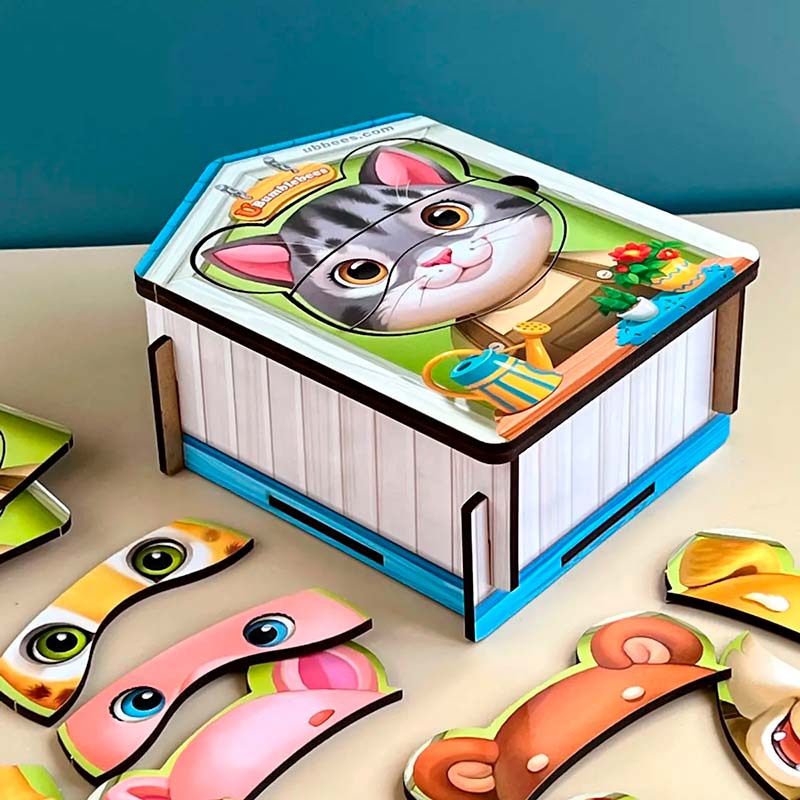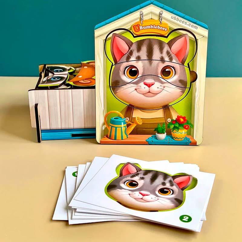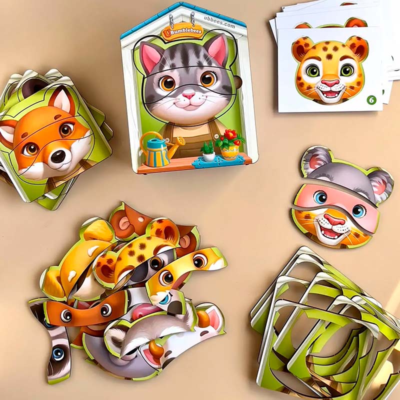 У наборi 39 деталей та 13 карток з тваринами. Завдання малюка: зiбрати тварин, як на малюнку. А ще можна створювати власних тваринок: додати котику вуха тигра або ротик собачки.