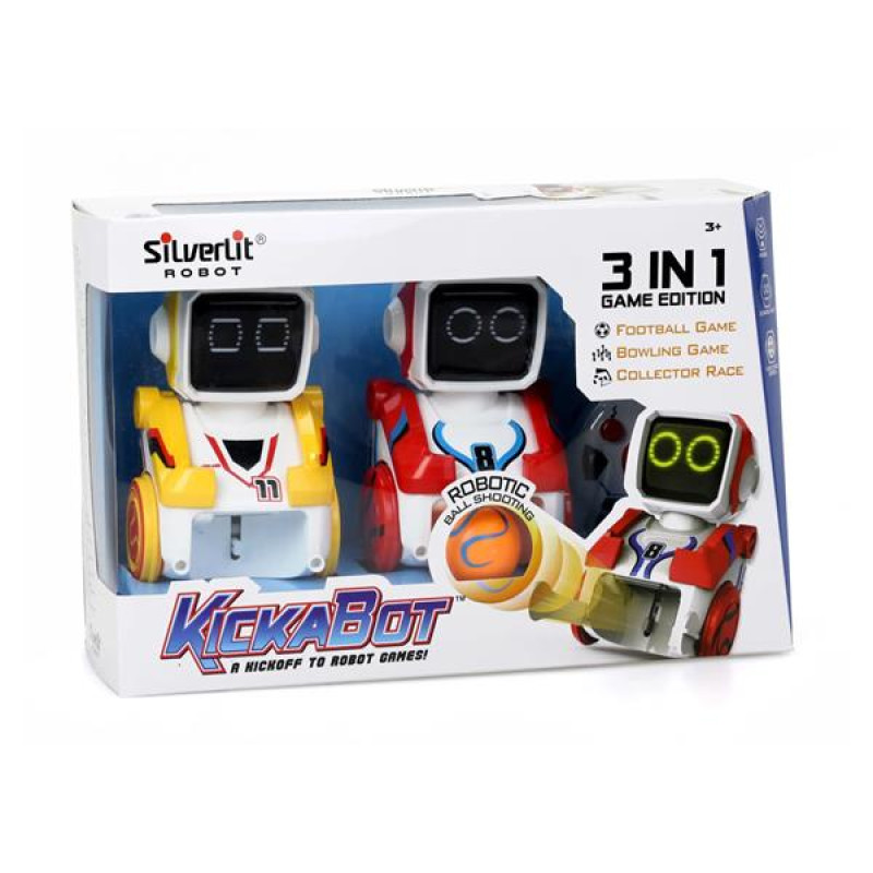 Якщо ваша дитина не уявляє свого життя без футболу та захоплюючих ігор, то цікавий ігровий набір з роботами-футболістами від бренду Silverlit стане для нього найкращим подарунком.У наборі представлено: 2 робота; 2 пульти дистанційного керування; 12 кеглів; 2 напрямні для м'яча; 2 воріт; м'яч; інструкція.Живлення: 3 батарейки типу ААА для робота, 2 батарейки типу ААА для пульта - в комплект не входять.Розмір робота складає 13 х 9 х 9 см.Ігровий набір дозволяє вибрати один із чотирьох варіантів гри: футбол, боулінг, хто швидше збере всі кеглі, хто більше заб'є м'ячів у ворота.