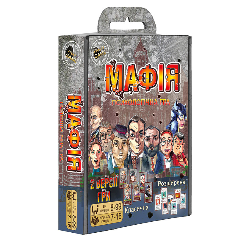 «Мафія» давно відома і всіма улюблена настільна гра, яка підходить для великих і не дуже компаній. Рольова гра з психологічним ухилом дозволяє не тільки весело і цікаво провести час в компанії друзів, але і дає можливість дитині розкрити свої таланти в невимушеній і дружній обстановці. Після призначення ведучого і розподілу ролей починається найцікавіше. Хто переможе у вічній сутичці між добром (мирні жителі) і злом (мафія) залежить від кожного гравця. Настільна гра «Мафія» (Strateg 00314) дозволяє задіяти від 4 до 16 осіб. Ілюстровані картки роблять гру більш насиченою та емоційною. На свій розсуд гравці вибирають варіанти гри - це може бути класична гра або розширена з діями, запропонована комплектація дозволяє використовувати обидва варіанти. Для тих, хто грає вперше або трохи забув правила, передбачена докладна інструкція, в якій можна знайти правила гри і повний опис ролей. В ігровому процесі активно задіяні розумові процес і уяву, розвивається логічне мислення, аналітичні здібності, уважність і спостережливість. Вік: від 8 років Матеріал карток: картон Кількість гравців: від 7 до 16 осіб В комплекті: 16 карток з персонажами (1 ведучий, 3 мафіозі, 1 перевертень, 1 маніяк, 1 жінка-кішка, 1 ніндзя, 1 доктор, 1 комісар , 1 детектив, 1 шпигун, 4 мирних жителя) і 26 карток діями і інструкція Розмір упаковки: 22х18х5 см